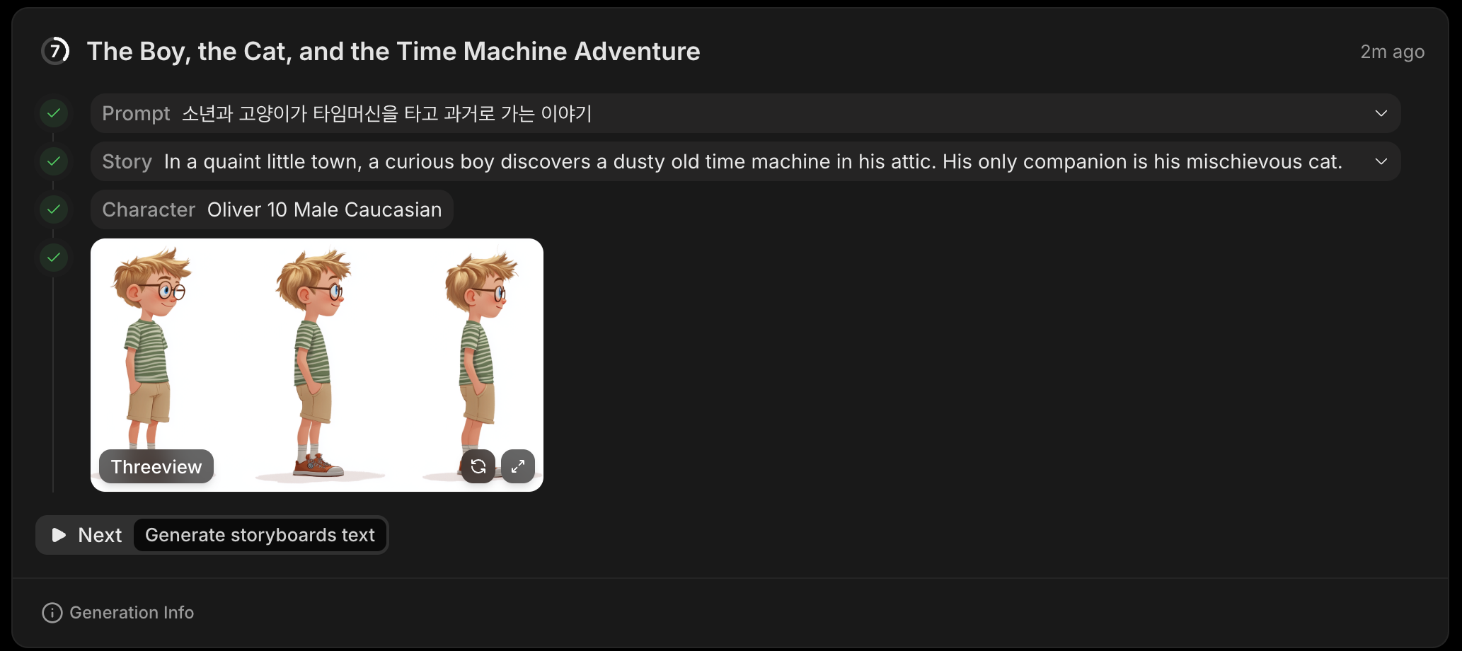 캐릭터가 씬마다 다르게 나오지 않고, 처음 설정한 스타일 그대로 유지되는 게 신기했어요.
