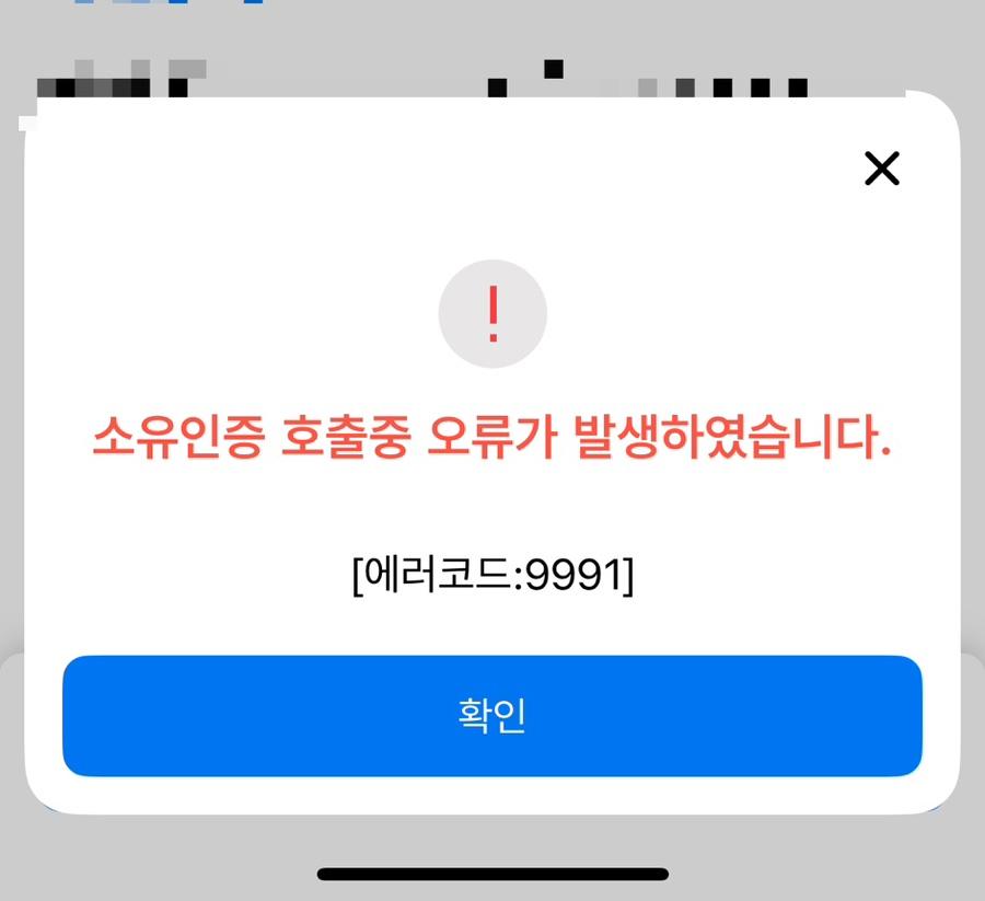 모바일 신분증 재발급 중 소유인증 호출중 오류(에러코드 9991) 원인 및 해결