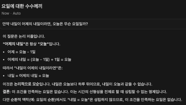 첫번째 질문은 맞았지만 두번째 질문은 실제 GPT와 달랐습니다. 세번째 질문은 GPT-5 왈 GPT-5 논리 추론력 테스트로 아주 유명한 질문이라는데 GPT-5는 "오늘은 오늘이다" 라고 대답했습니다.