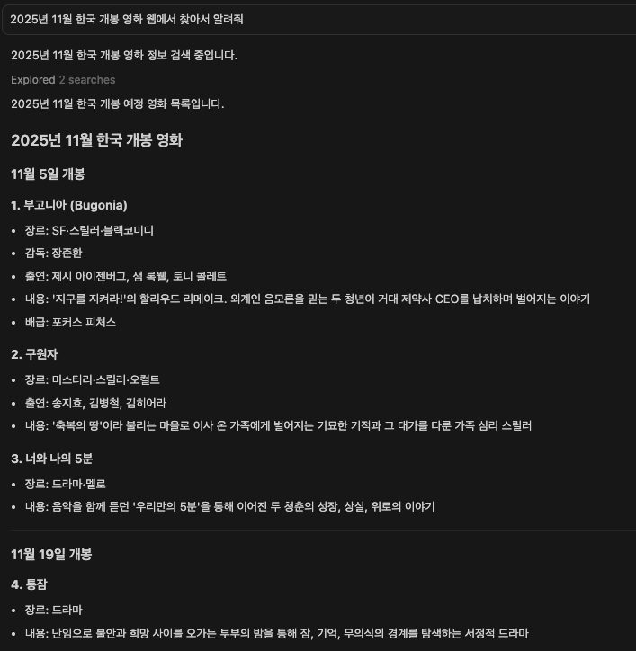 5. “2025년 11월 한국 개봉 영화 웹에서 찾아서 알려줘” — GPT-5 vs Cursor GPT-5비교