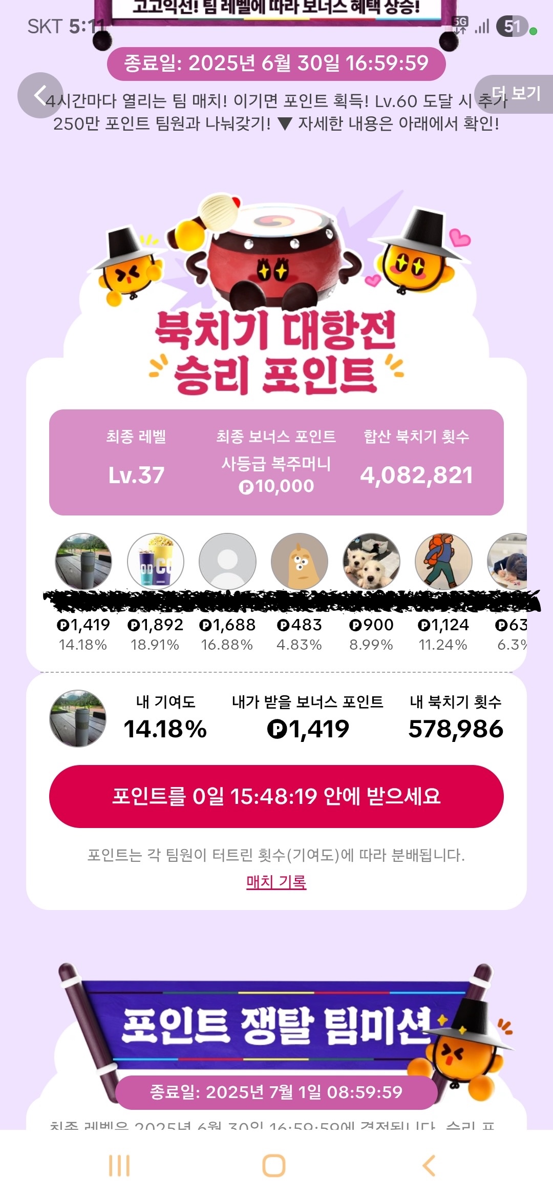 - 제 경우 37레벨에 팀 상금이 10,000원, 11명이 나눠가지니 개인당 900~1,000원도 안 됐습니다ㅎㅎ..