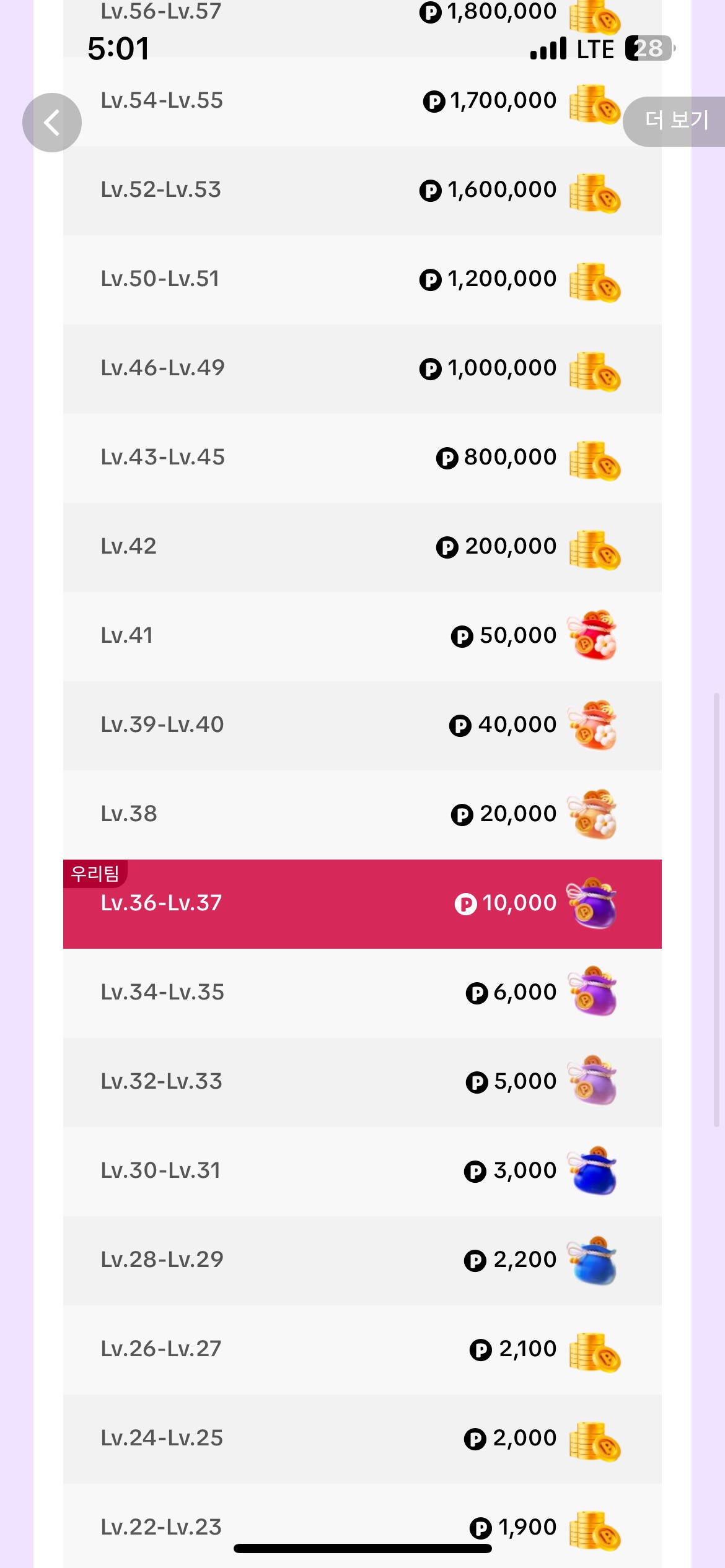 • 일반적으로 28~41레벨 구간은 보상을 ‘복주머니’로 감추고 공개하지 않는 구조입니다. 이 구간이 가장 많이 받아가실 구간인데 실제로 상금이 얼마인지 모르는 상태에서 진행하게 되는 셈이죠.
